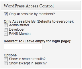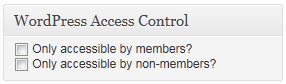 The purpose of WordPress Access Control is to provide an easy interface to users for restricting access to content. It was designed for use on members sites where not all content should be accessible by the public, such as with organizations or pay-sites.